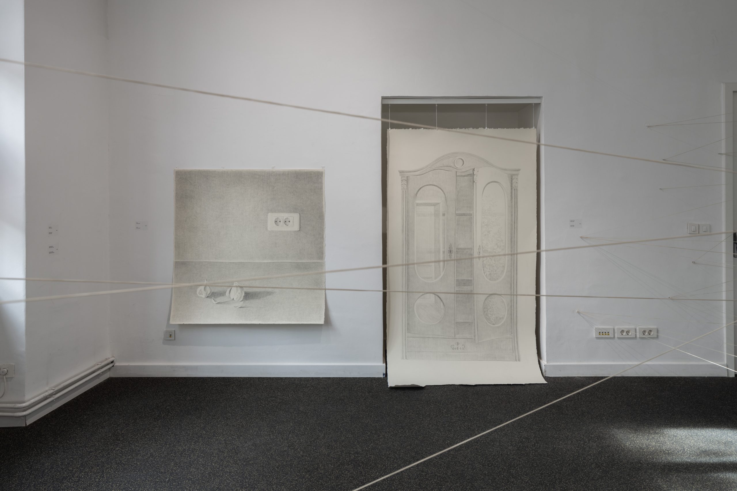 Na prazninama nastalima unutar mreže postavljeni su crteži različitih dimenzija, rukom iskinutih rubova, izrađeni olovkom na papiru, a prikazuju interijere iz autoričina doma ili detalje koji ju okružuju i pobuđuju sjećanja na određena subjektivna iskustva.