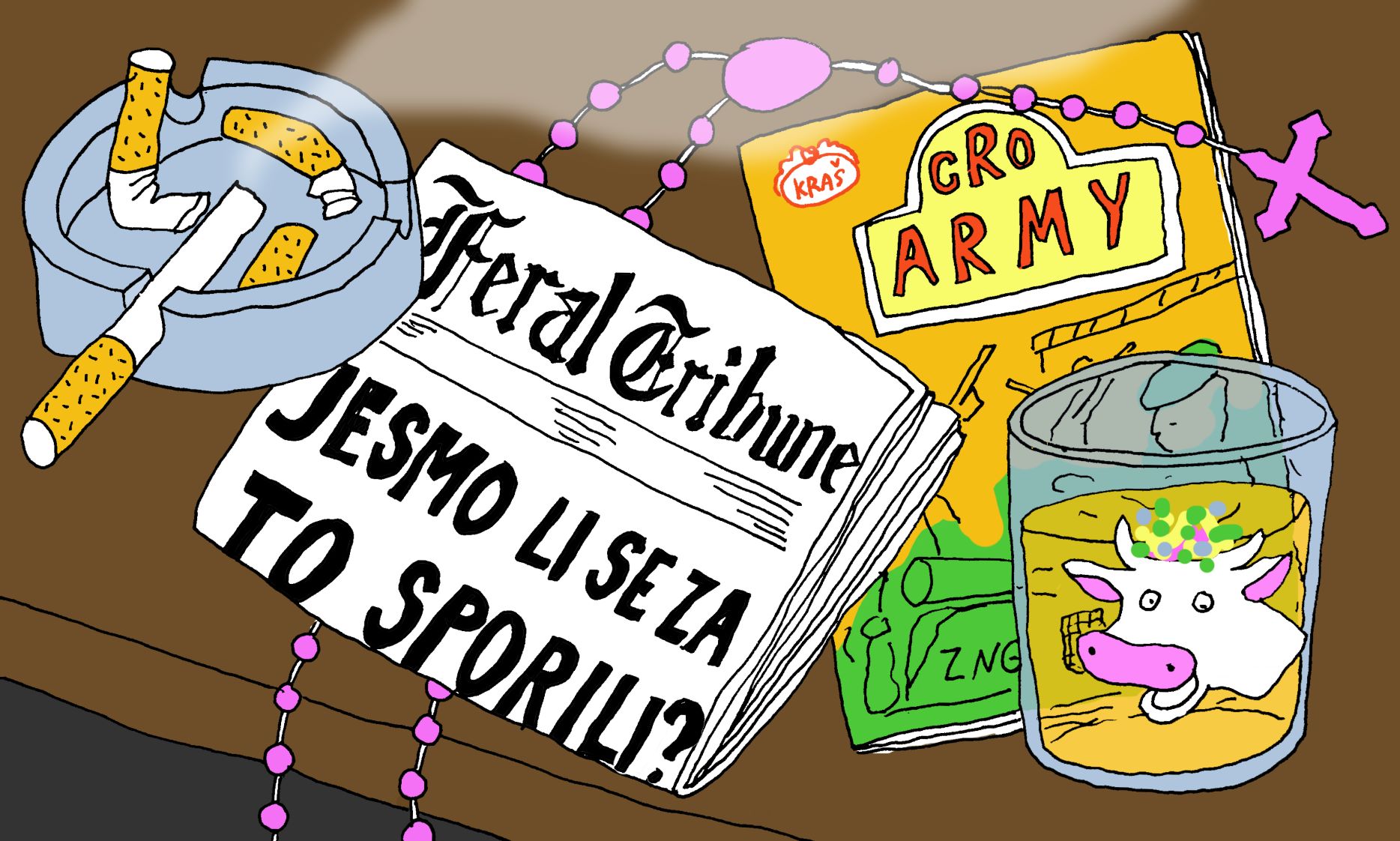 Tijekom 1990-ih još nisam krenuo ni u srednju školu, pa stoga ne mogu reći da sam posjećivao izložbe ili pratio kulturnu scenu. Ako zanemarim vizualnu memoriju koja se tiče televizijskih priloga o ratu i politici, ili pak čokoladica CRO ARMY sa samoljepljivim sličicama respektabilnog naoružanja i prizorima hrvatskih vojnika u različitim akcijama, mogu reći da se moje znanje, kao i većine mojih vršnjaka, o tome razdoblju formiralo retrogradno, pogledom na retrovizor. U mom slučaju retrovizor su bile knjige. Tako knjige koje su objavljivali Feral Tribune i Arkzin predstavljaju ne samo svjedočanstvo o tome vremenu, već i kulturne artefakte koji na vizualnoj razini imaju jasnu raspoznatljivost i vraćaju me u 1990-e. Međutim, ako bih morao izabrati samo jedno umjetničko djelo koje smatram reprezentativnim za 1990-e u Hrvatskoj, izbor bi bio sam tjednik Feral Tribune. To „permanentno umjetničko djelo“ (kako ga je Feralov biograf Boris Pavelić nazvao) ne samo da je osvjetlalo obraz cijelom jednom društvu, već je i na razini svoje vizualne prepoznatljivosti postalo nešto poput neželjene tetovaže jednog sistema.