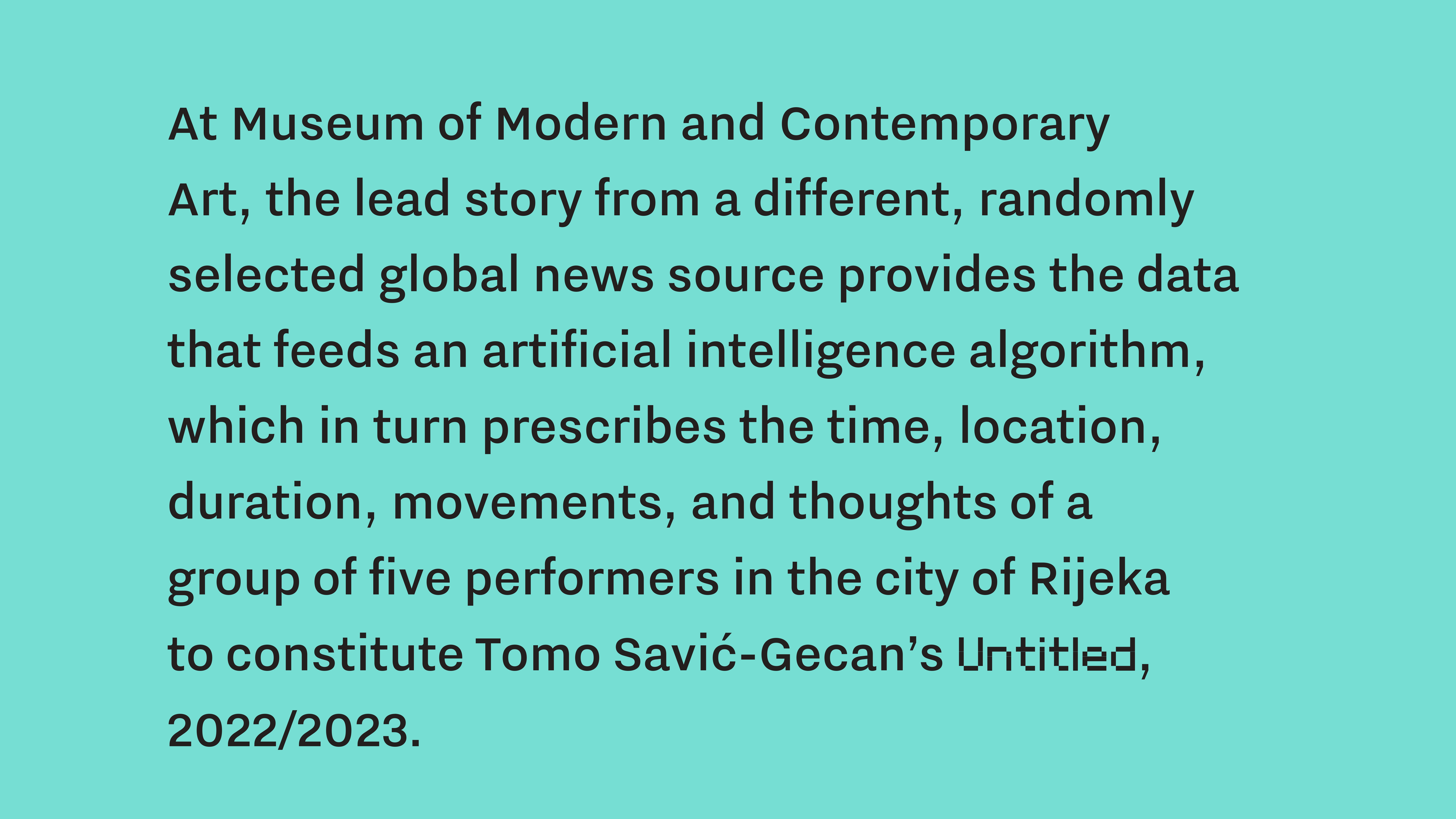 The project “Untitled, 2022/2023” by artist Tomo Savić Gecan is based on the project “Untitled (Croatian Pavillion), 2022”, which was selected by curator Elena Filipović to represent Croatia at the 59th Venice Biennale of Art. Apart from the performers, his project “Untitled, 2022/2023” is unlike his previous projects due to arbitrary links established between physically remote components. These links are no longer created solely by the artist. They are products of orchestrated collaborations (AI programmers, the choreographer, female and male performers and the AI team), leaving the last word to the decisions taken by AI.